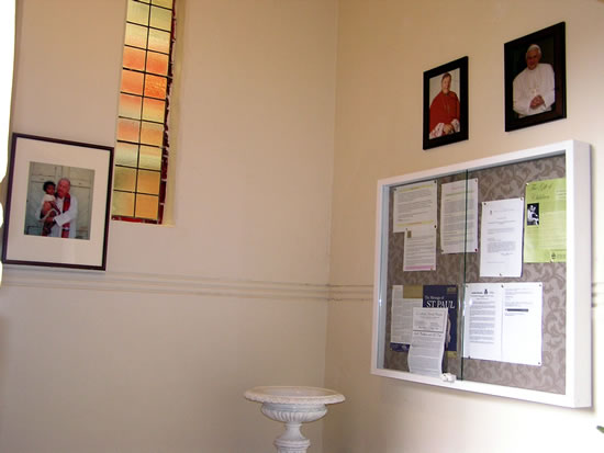 Several weeks ago the church foyer was given a makeover – rough patches to damaged plaster, sloppily applied paint (traces of which may still be found on Ted’s portrait), and a brand new notice board (lockable, no doubt to protect the offensive notices so dear to the Neocat heart).